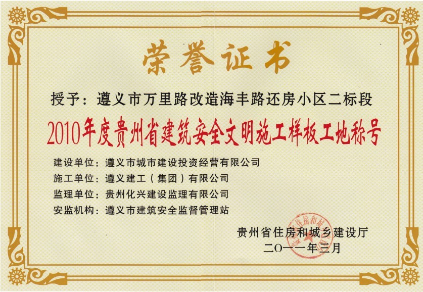 遵義海豐還房小區(qū)榮獲“2010年貴州省建筑安全文明施工樣板工地”稱號(hào)